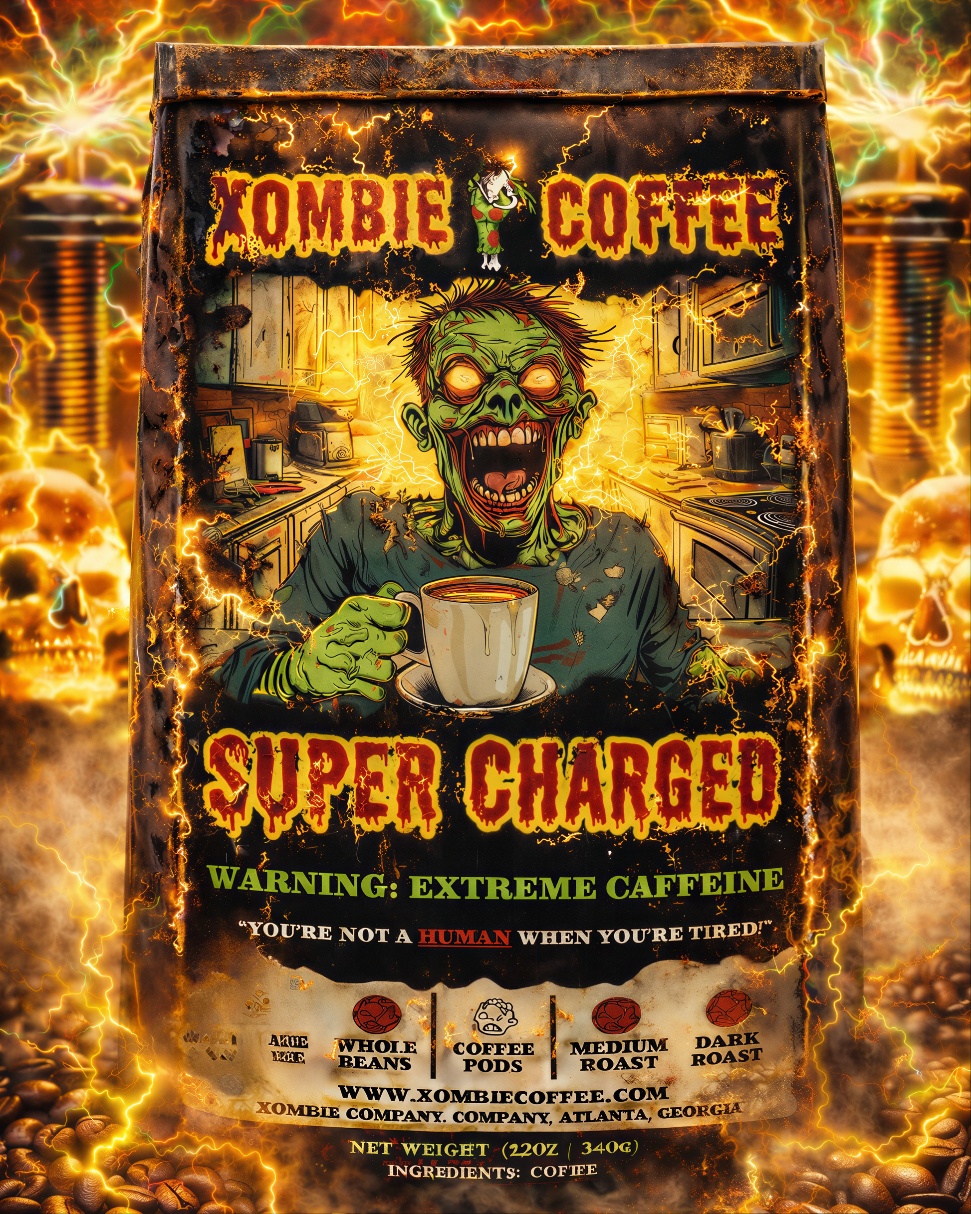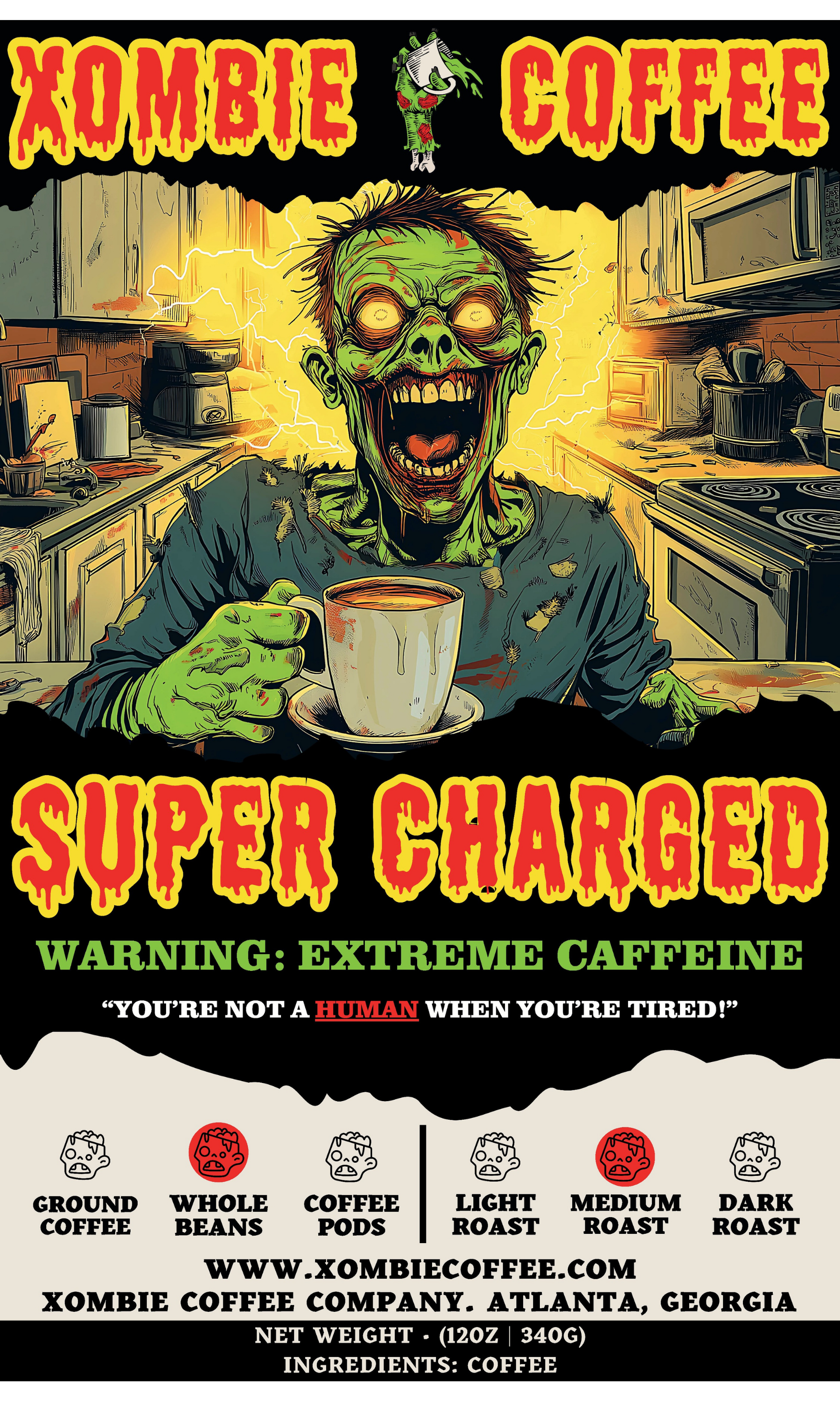 Super Charged is the coffee equivalent of a lightning bolt to the brain. This turbocharged blend of organic Arabica and Robusta beans packs enough caffeine to shock zombies back to humanity and fuel you through the wildest days. Need pre-work fuel? Got a schedule from hell? This is your liquid savior.